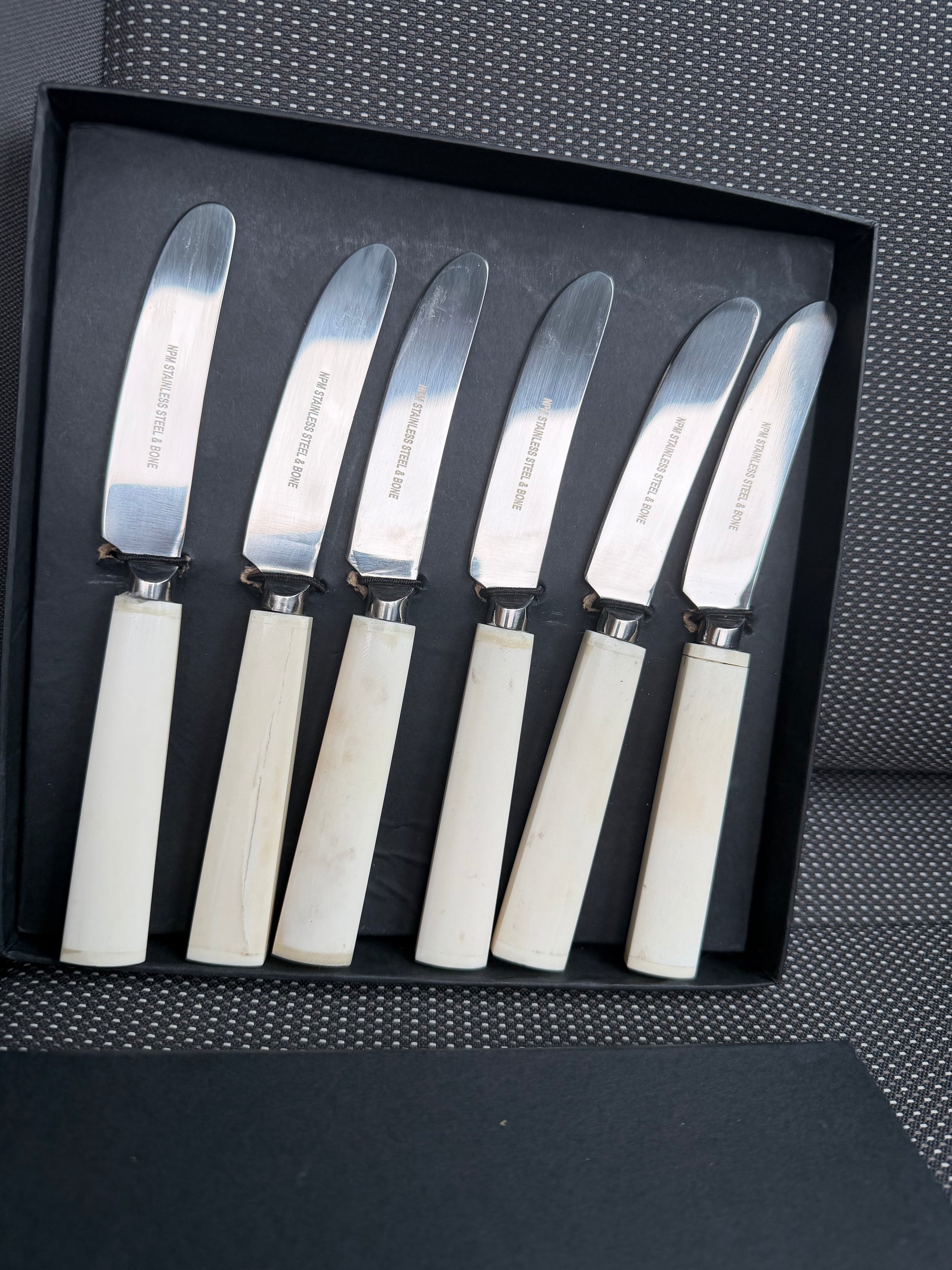Set of 6 Stainless steel and bone butter knives, comes gift boxed.